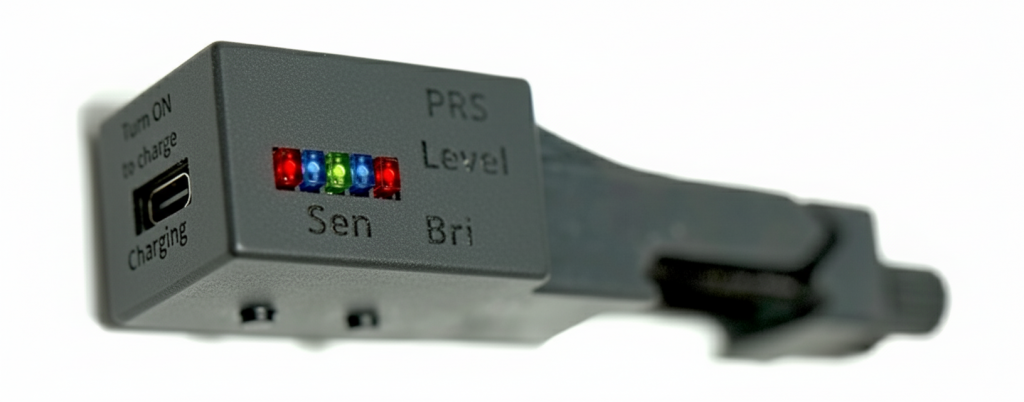 Sensitivity button (Sens): Located on the bottom of the device has 2 main functions. Adjust the angular sensitivity of the Level in 3 stages explained in the manual. This can be done by short presses. After each short press, the left LED blinks one, two, or three times to show the selected level. The Sensitivity measurement units are explained in the manual.